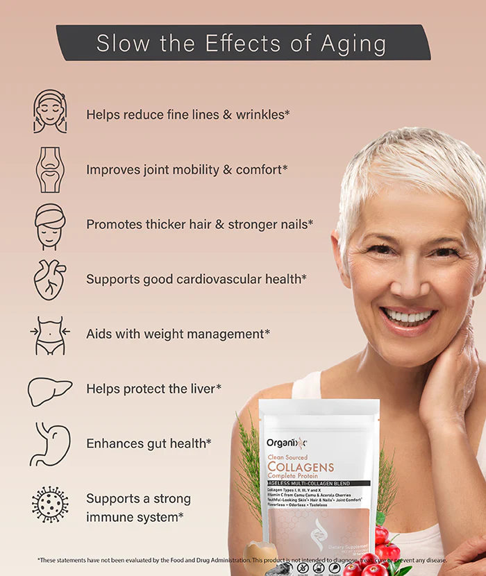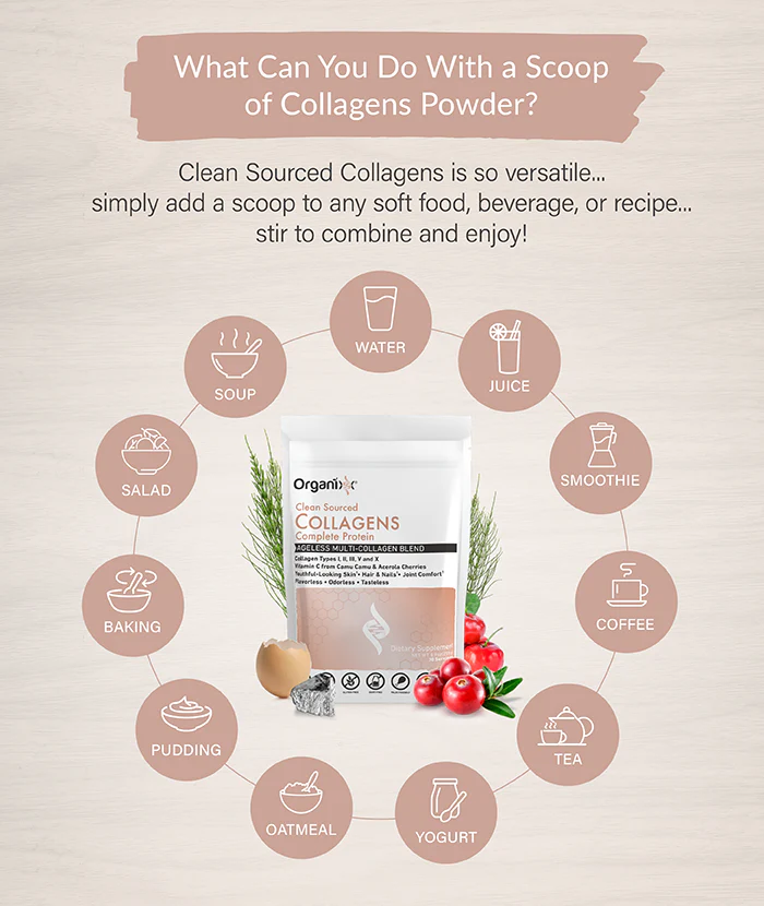 Discover Clean Sourced Collagens from Organixx – a premium multi-type collagen blend that supports healthy skin, joints, hair & gut. Clean, potent, and effective. Clean Sourced Collagens by Organixx is a next-level wellness formula designed to support skin, joints, hair, and gut health. With five clean-sourced collagen types, synergistic nutrients, and enzyme support, it’s more than just another supplement—it’s a comprehensive tool for graceful aging and inner vitality.