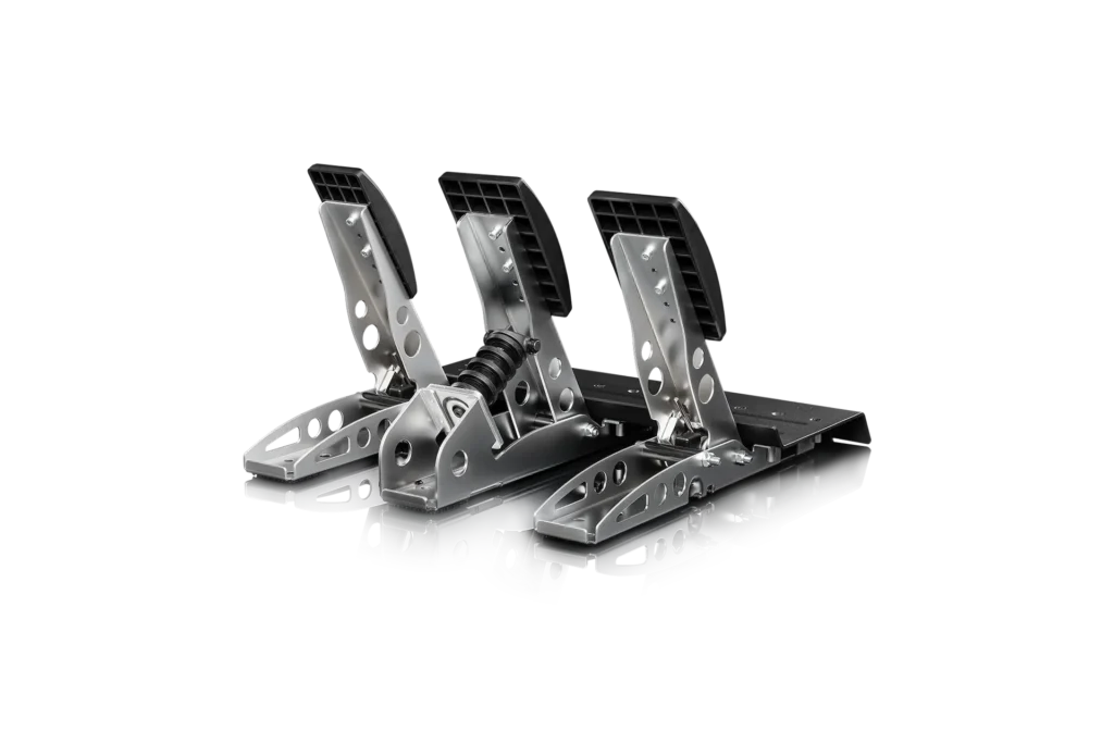 The Fanatec CSL Pedals LC combines the standard CSL Pedals with a Load Cell Brake Kit. This transforms the typical spring-based brake pedal into a pressure-sensitive system, giving racers the most authentic braking feedback possible. Built primarily from metal, the CSL Pedals LC offers strength, stability, and long-term durability. It’s a perfect entry point for beginners who want realism — and a reliable upgrade path for experienced sim drivers looking to enhance their control.