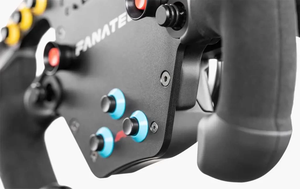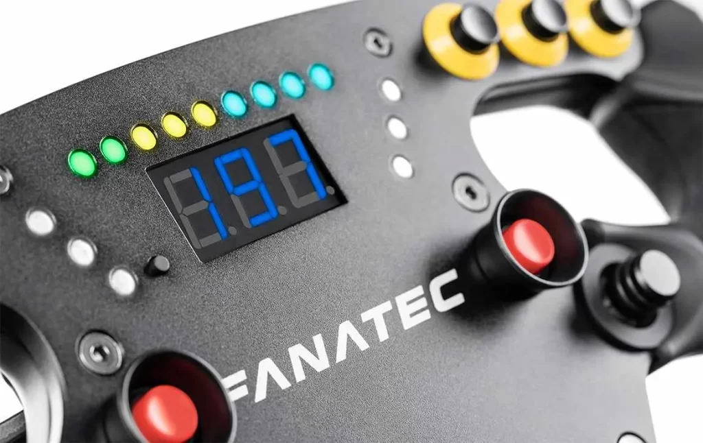 The Fanatec ClubSport F1 Esports V2 includes RGB LED rev lights, multi-color flag LEDs, thumb encoders, rotary switches, and numerous programmable inputs. It supports Fanatec’s FanaLab software for deep customization of telemetry, LED profiles, vibration effects, and more.