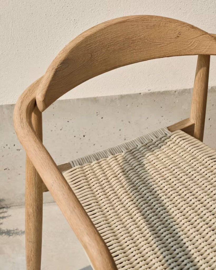 The Nina stackable chair is designed to complement various outdoor themes — from rustic and bohemian to coastal and contemporary. The warm tones of acacia wood pair beautifully with the neutral ecru cord, creating a calming, earthy palette that blends effortlessly into nature.