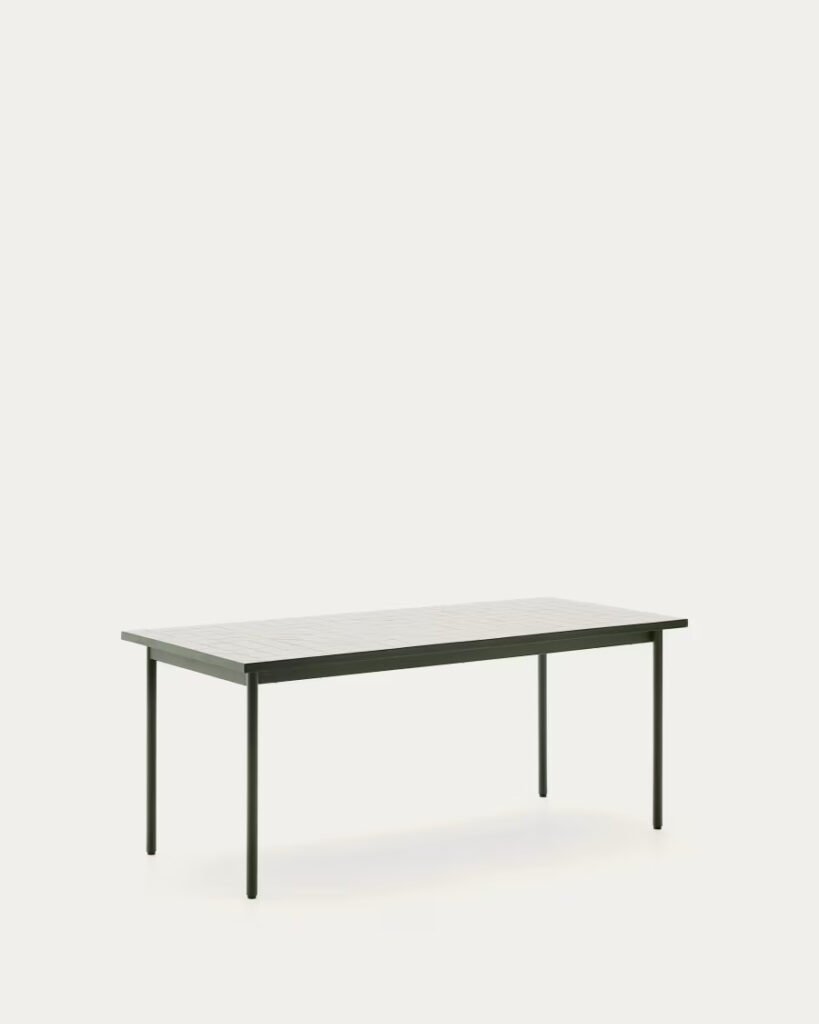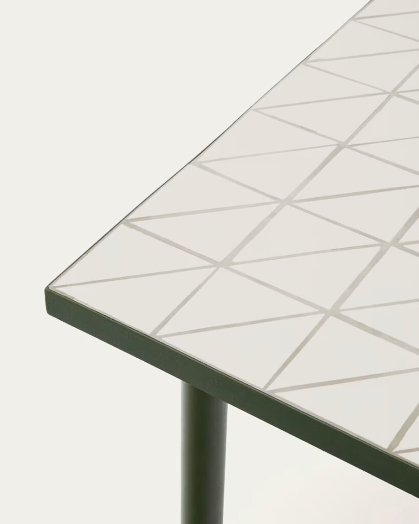 If you’re on the hunt for garden tables that combine enduring quality with exceptional style, look no further than the Maurina outdoor table. With its unique blend of green galvanized steel and handcrafted ecru-colored tiles, this table is more than just furniture — it’s a statement piece that brings charm and character to any outdoor setting.