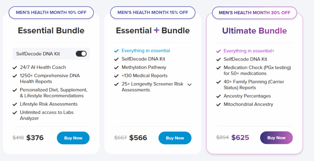 • Multi-faceted tools: Includes Ancestry, Medication Check (PGx), carrier screening, and lab analysis selfdecode.com.