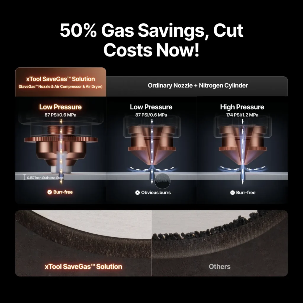 Traditional metal cutting often relies on nitrogen, argon, or oxygen tanks—each costly and cumbersome. The xTool Air Dryer, when paired with the xTool SaveGas™ nozzle, allows users to: