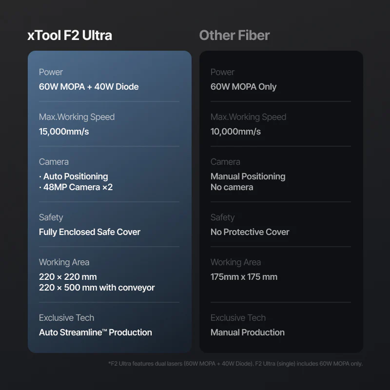 The xTool F2 Ultra features a 60W MOPA fiber laser and a 40W diode laser, giving users the flexibility to work with a wide range of materials: